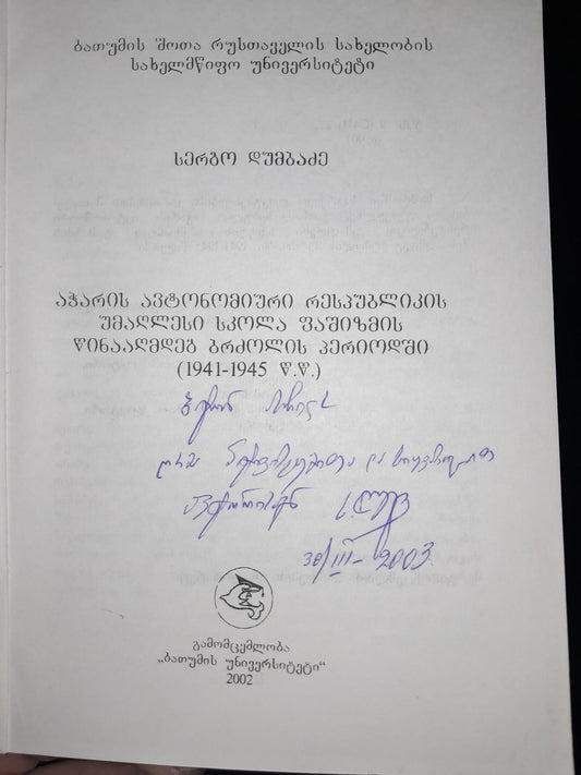 აჭარის ავტონომიური რესპუბლიკის უმაღლესი სკოლა ფაშიზმის წინააღმდეგ ბრძოლის პერიოდში. ავტორი: სერგო დუმბაძე