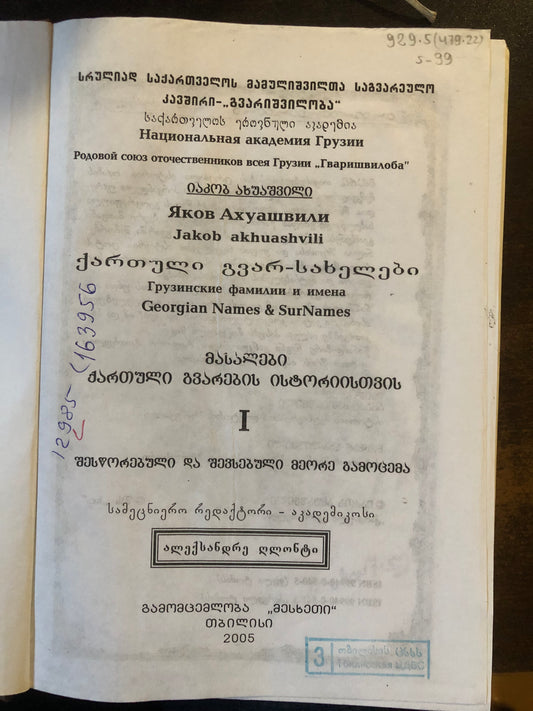 იაკობ ახუაშვილი - ქართული გვარ-სახელები (ტომი I)