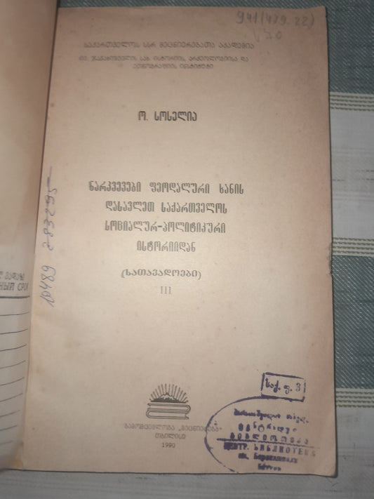 ნარკვევები ფეოდალური ხანის დასავლეთ საქართველოს ისტორიიდან (სათავადოები). ავტორი: ო. სოსელია